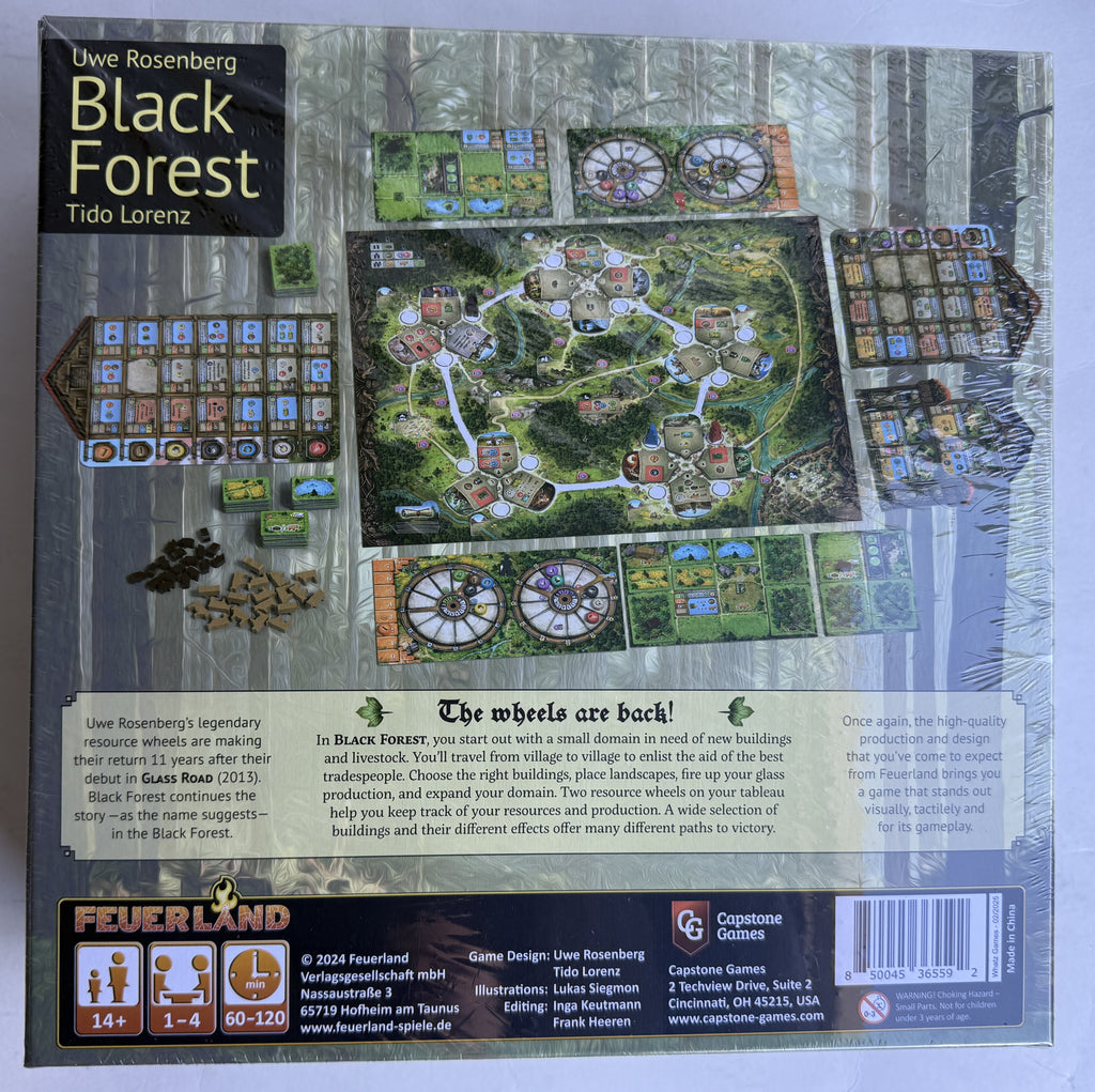Uwe Rosenberg’s resource wheels, made famous in Glass Road (2013), return in Black Forest. Two resource wheels on your tableau help you keep track of your resources and production. Black Forest continues the story - as the name suggests — in the Black Forest. Among others, the main difference between the two games is the use of worker placement in Black Forest instead of simultaneous action selection.