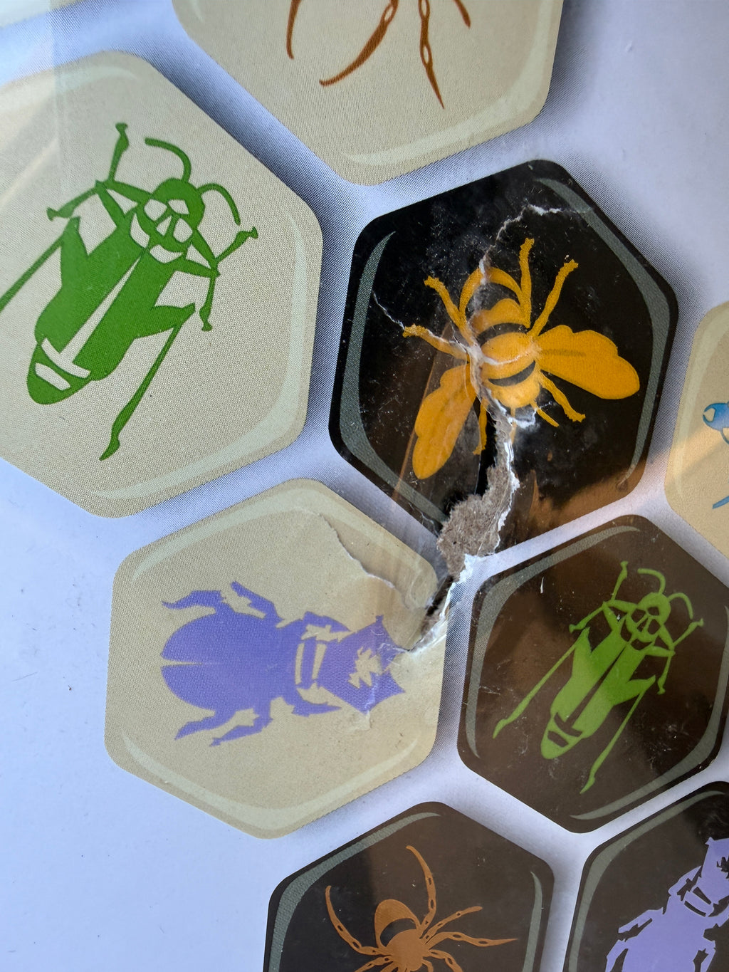 The soldier ants battle to keep control of the outside of the hive, whilst the Beetles climb up to dominate the top. Spiders moving into holding positions as the Grass Hoppers jump in for the kill. Keeping one eye on the hive and the other on your opponents reserves, the tension builds as one wrong move will see your Queen Bee quickly engulfed .... game over!