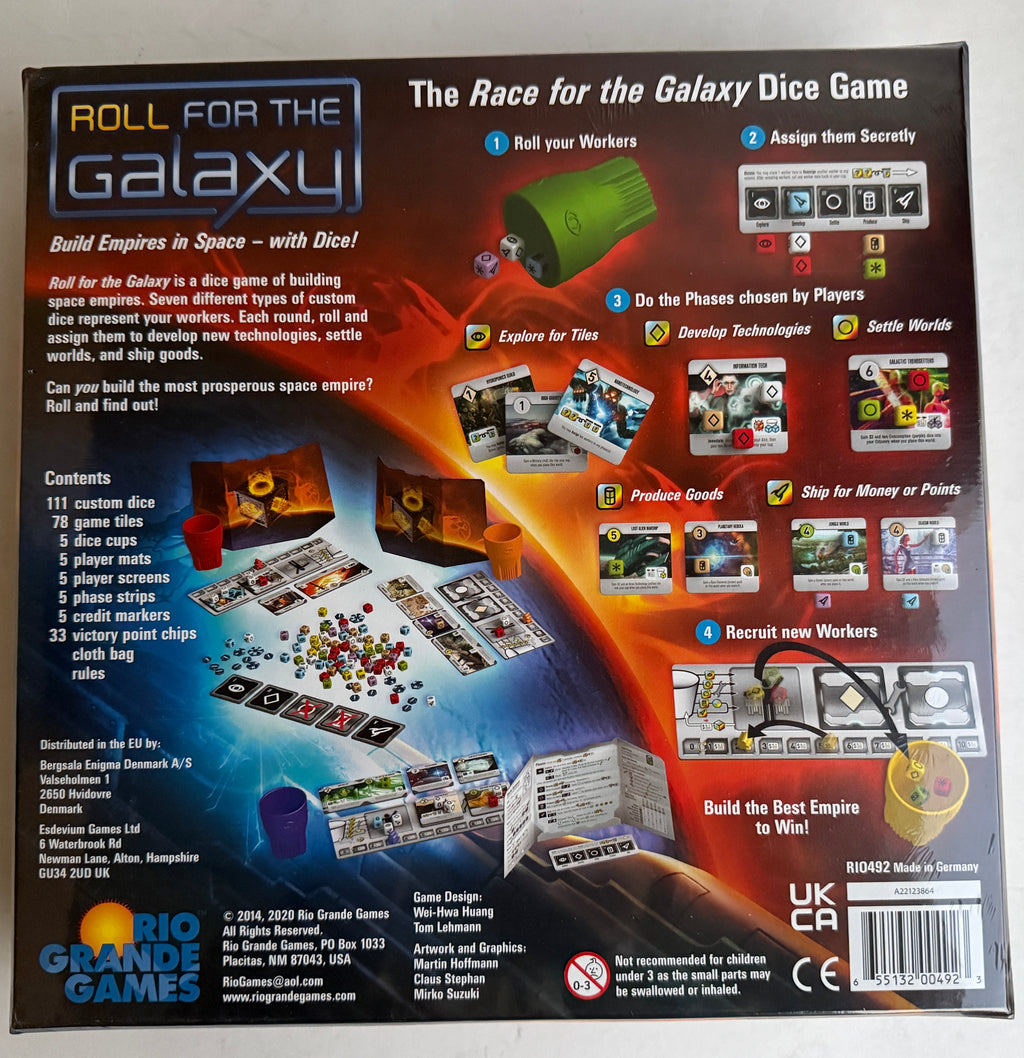 Roll for the Galaxy is a dice game of building space empires for 2-5 players. Your dice represent your populace, whom you direct to develop new technologies, settle worlds, and ship goods. The player who best manages his workers and builds the most prosperous empire wins!