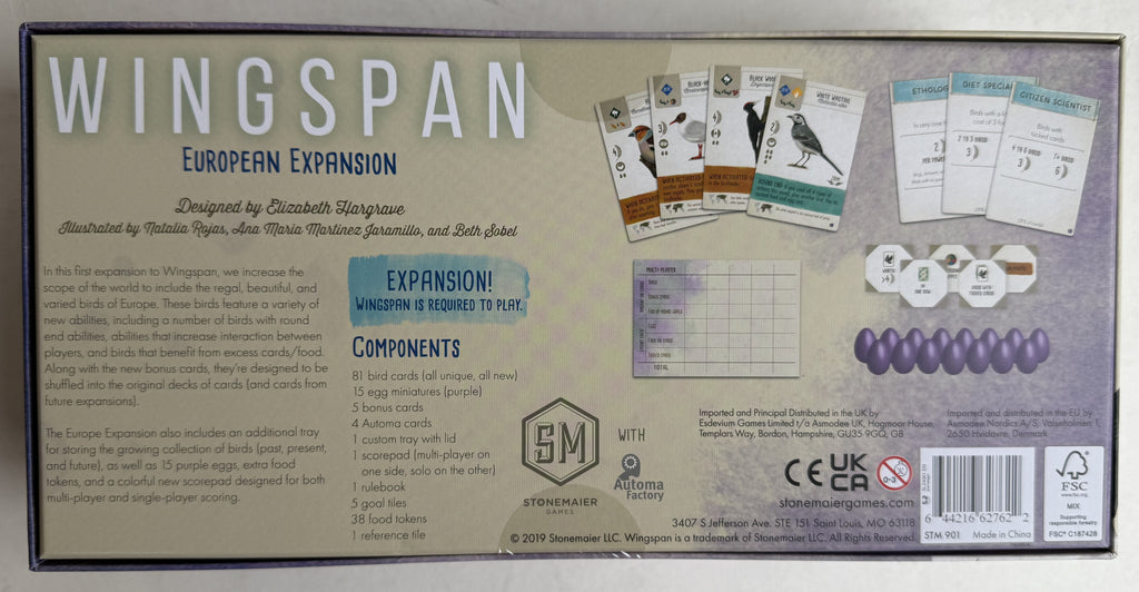 In this first expansion to Wingspan, we increase the scope of the world to include the regal, beautiful, and varied birds of Europe. These birds feature a variety of new abilities, including a number of birds with round end abilities, abilities that increase interaction between players, and birds that benefit from excess cards/food. Along with the new bonus cards, they’re designed to be shuffled into the original decks of cards (and cards from future expansions).