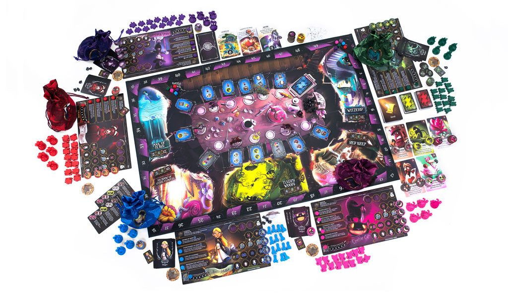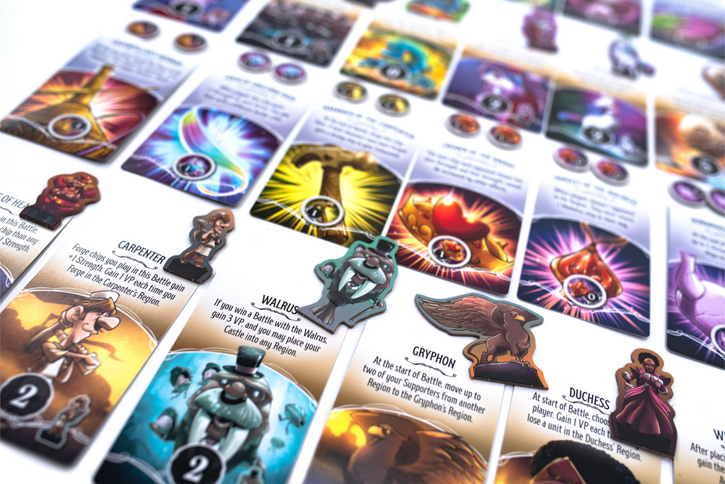 In Wonderland's War, 2-5 players take the role as a faction leader who has been invited to the Hatter's tea party. Drink tea and eat cake as you move around the table drafting cards to gather your forces, build your towers, upgrade your leader, and recruit Wonderlandians to your cause — but one must be careful as shards of the Looking Glass are spread throughout Wonderland. Once all the plates are empty, the Tea Party is over and war begins. Use the forces you gathered to battle your enemies in familiar locations, but make sure not to draw your Madness chips or your supporters will abandon your cause and you will be out of the fight. Can you muster enough strength to win the battle, or will you just try to complete Quests instead by meeting the right conditions such as gaining region bonuses and set collection throughout the game?