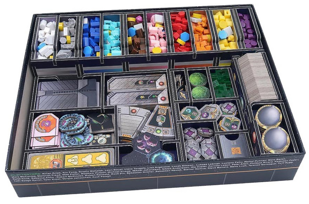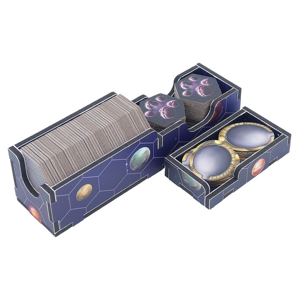 Full color insert compatible with Gaia Project®, including space for The Lost Fleet® expansion. The design provides both efficient storage and improved game play. Many of the trays can be utilized during the game, and they greatly aid set-up and clear-away times. The rules and boards act as a lid on top of the trays. The full color print really brings the trays to life, tying them in with the theme of the game and making it easier to see which components go where.