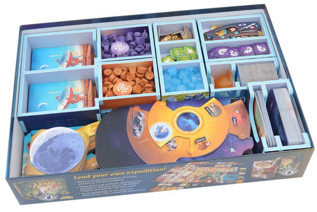 Official full color insert compatible with SETI®. The design provides both efficient storage and improved game play. Many of the trays can be utilized during the game, and they greatly aid set-up and clear-away times. The rules and boards act as a lid on top of the trays. The full color print really brings the trays to life, tying them in with the theme of the game and making it easier to see which components go where.