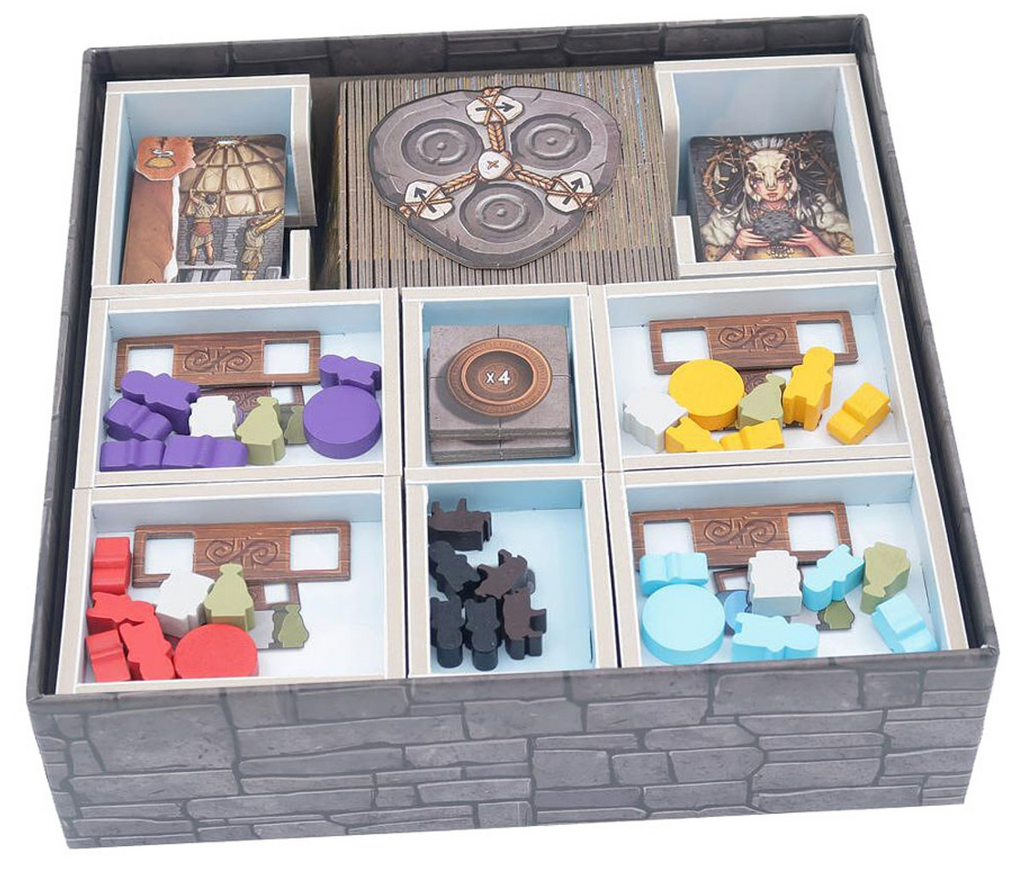 Official full color insert compatible with Skara Brae®. The design provides both efficient storage and improved game play. Many of the trays can be utilized during the game, and they greatly aid set-up and clear-away times. The rules and boards act as a lid on top of the trays. The full color print really brings the trays to life, tying them in with the theme of the game and making it easier to see which components go where.