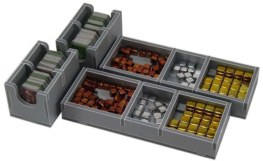 Insert compatible with Terraforming Mars®, and includes space for the Hellas & Elysium®, Venus Next®, Prelude® and Colonies® expansions. The design provides both efficient storage and improved game play. Many of the trays can be utilized during the game, and they greatly aid set-up and clear-away times. The boards and player boards act as a lid on top of the trays. There is space for all cards to be sleeved.