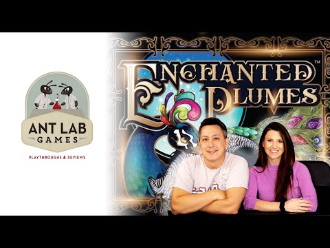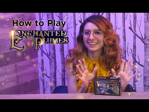 The object of Enchanted Plumes™ is to assemble dazzling peacock plumes and score the most points when the Peahen appears at the end of the game. Players manage their hand of Feather cards, building plumes in descending rows from top to bottom. As the plumes are built, cards may only be added if they match the colors of Feather cards in rows above. During final scoring, the top row of each plume is counted against your score, while cards in lower rows earn you points; complete Peacocks will earn you valuable bonus points!