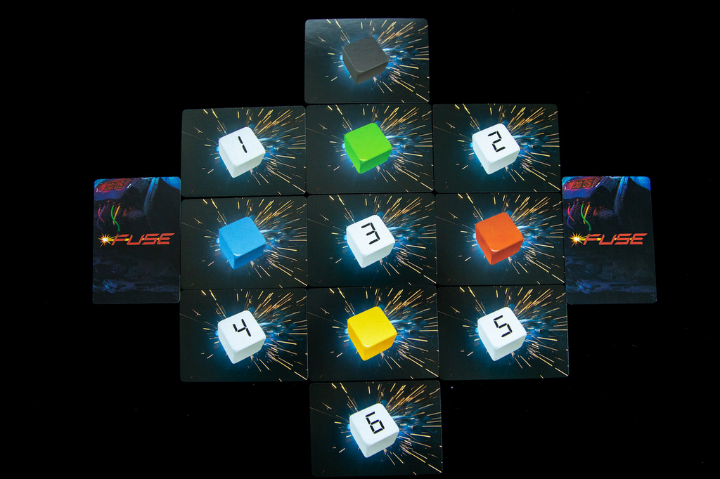 FUSE is a real-time co-operative game that employs 25 dice and 76 cards. Each game is set to a ten minute timer, and players must work together in that ten minutes to defuse all of the bombs. Each bomb is represented by a card which needs a certain combination of dice in order to defuse it. A player will draw a number of dice equal to the number of players out of a bag and roll them. Players must then decide who will get which dice, but each player must take one and only one.