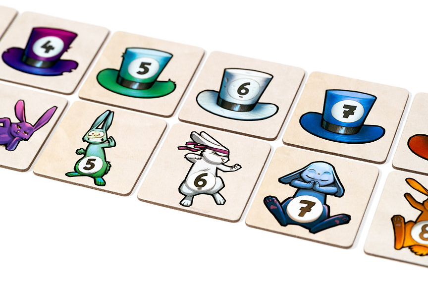 The game design is straightforward. At first, place randomly a Rabbit tile face-down under a Hat tile face up. Then, place Dove tokens, depending of the number of players.