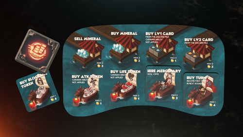 - Action Phase: Roll the dice and activate cards built on the territory board, using dice.