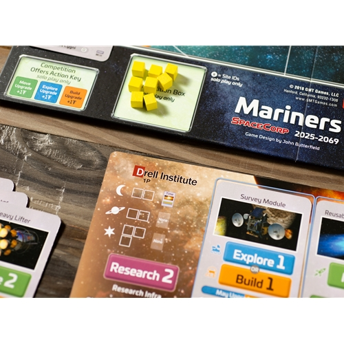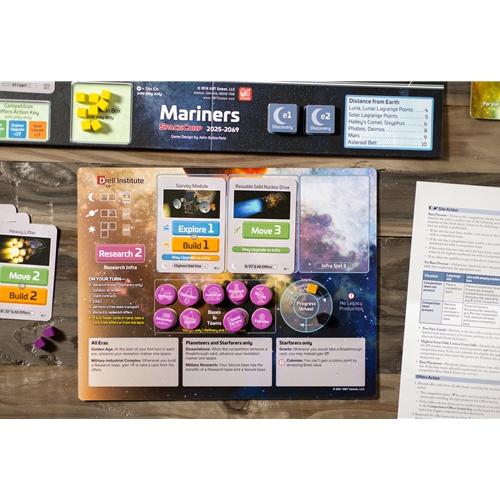 SpaceCorp: Ventures is the first module for SpaceCorp: 2025-2300AD, the game of exploring and developing the Solar System and beyond. SpaceCorp: Ventures introduces unique enterprises via fourteen HQ mats, each putting a player in control of a different corporation, agency, or institution with its own capabilities and missions. Each HQ assigns specific start cards, Infra, advantages, and limitations for all three eras. These advantages and limitations evolve in Planeteers and Starfarers, and each HQ has a special, alternate final profit option at game end.