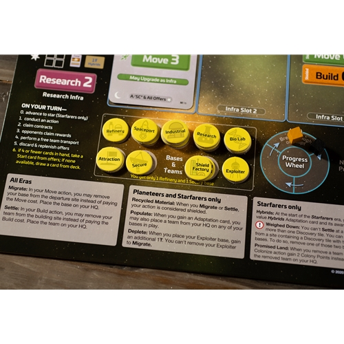 Ten of the fourteen HQ mats can be flipped over to play the SpaceCorp solitaire game with an enhanced HQ against the competition AI.