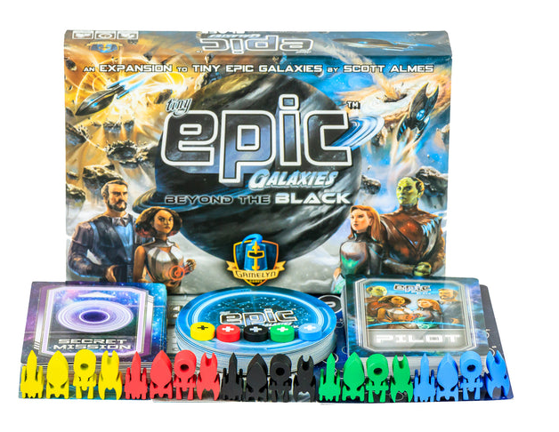 30 Pilot Cards, 20 Advanced Ships, 30 Exploration Cards, 1 Exploration Mat, 5 Hanger Mats/ Rogue Galaxy Mats, 12 Planet Cards, 8 Secret Mission Cards, 1 Rulebook, 1 Scoring Mat, 5 Score Tokens.