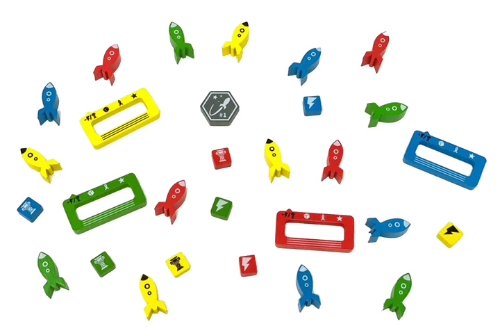 4 Galaxy Mats, 1 Dice Activation Card, 4 Wooden Galaxy Sliders, 8 Wooden Resource Tokens, 1 Wooden First Player Token, 30 Planet Cards, 6 Custom Dice, 16 Wooden Ships, 1 Rule Book.