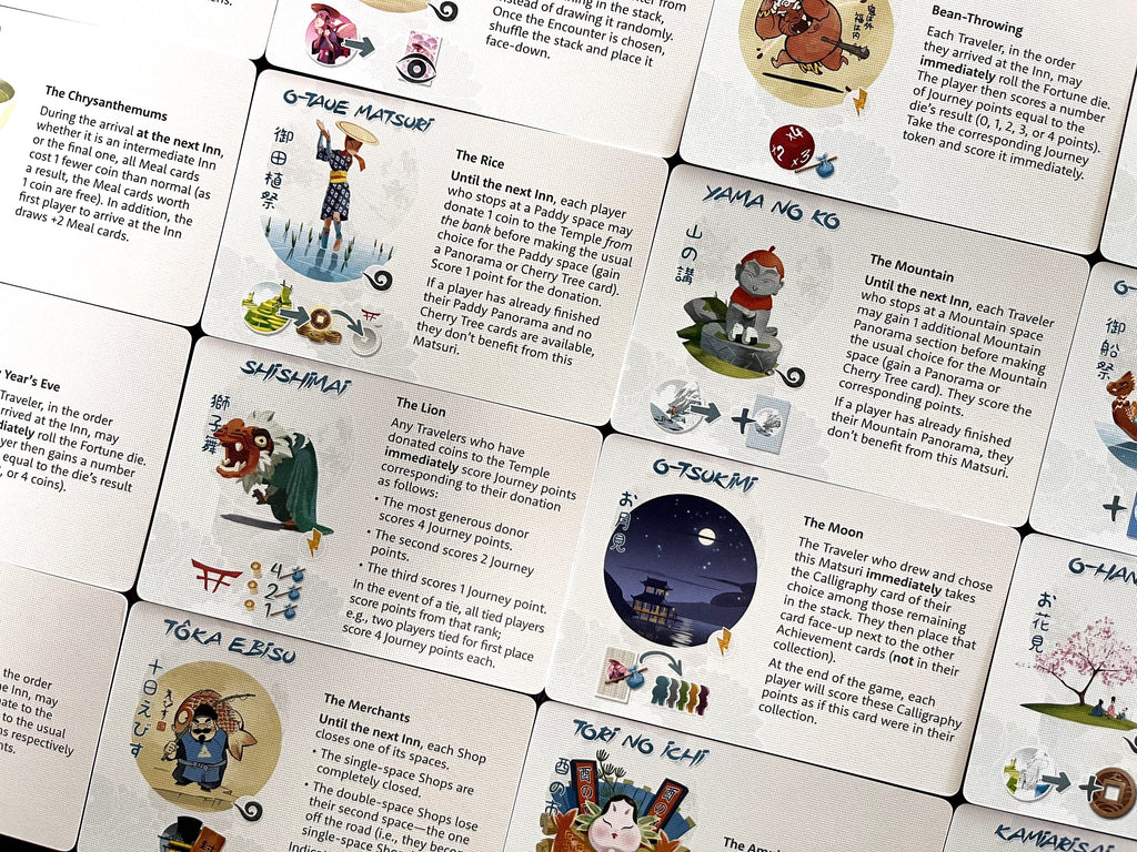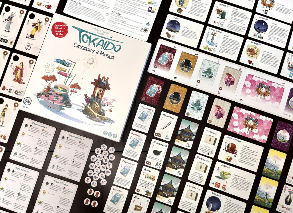 Tokaido: Crossroads & Matsuri combines the original two expansions and most promos into one box, adding a level of complexity to the core game. All components fit into the core Tokaido box.
