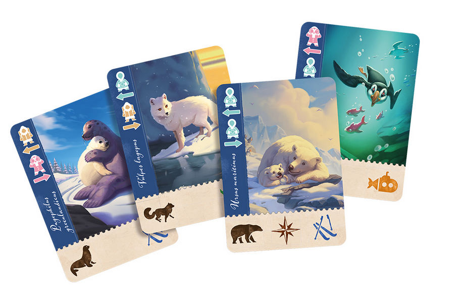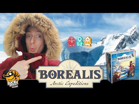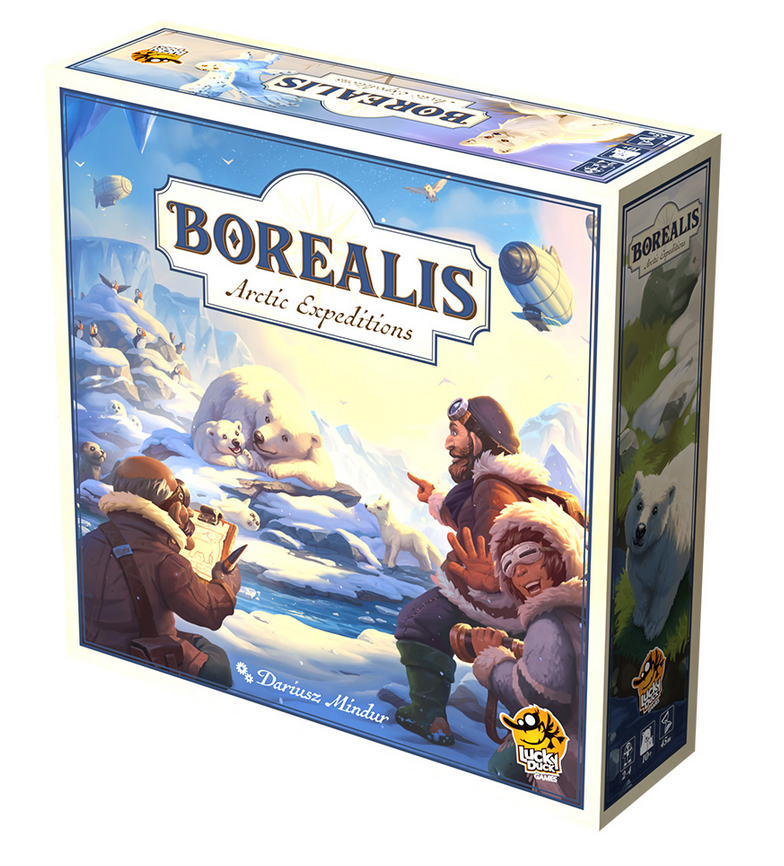 In Borealis: Arctic Expedition you become leaders of teams of scientists who venture into uncharted boreal territories to observe wild animals. To succeed, you need to coordinate the efforts of your 9-person crew of specialists from 3 different fields of expertise, represented by meeples of different colors. You also have to choose suitable modes of transport through inaccessible lands, ices and waters of the Far North. The one who gathers the most impressive collection of observed species while traveling deepest into the frosty land, will gain everlasting fame together with their own encyclopedia entry and a tiny snow-covered island named after them.
