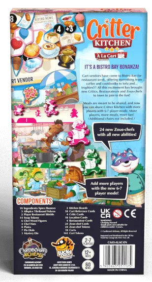 Critter Kitchen: À La Cart adds fun twists to locations, while additional Zous Chefs, critics, restaurateurs and rumors increase replayability. The 6/7 player mode allows you to bring everyone to the table on game night.