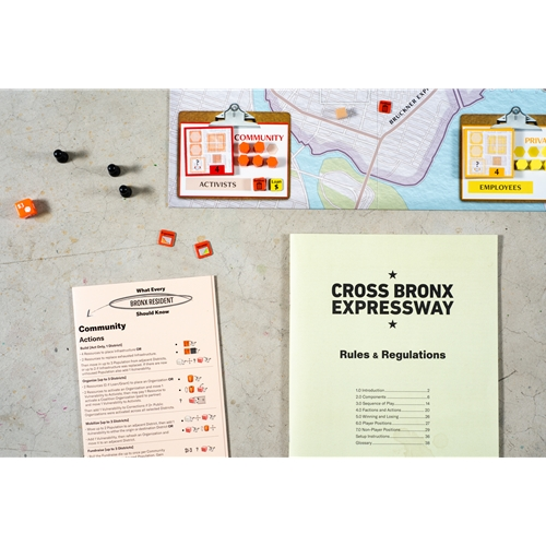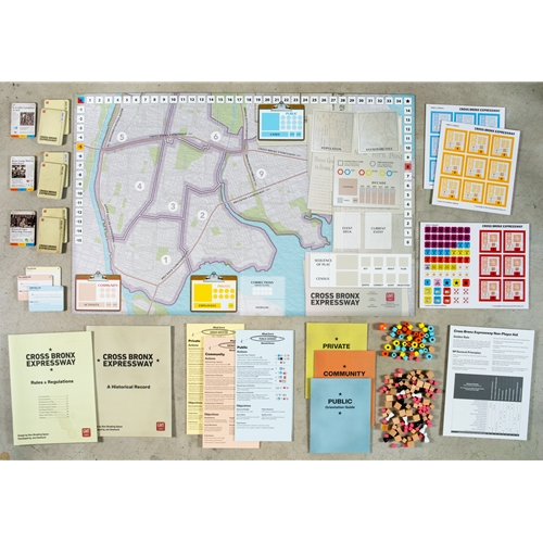 Cross Bronx Expressway is the third game in the Irregular Conflicts Series. It simulates the socio-economic processes of urban development, and the human costs that result, as a competitive city-builder with collective loss conditions. Players control one of three asymmetric factions working in the South Bronx between 1940 and 2000, pursuing their own goals while cooperating to keep the borough viable. Through a card driven sequence of play, they will work to solve the economic challenges facing the area by building infrastructure and organizations, forming coalitions, mitigating the multitude of issues facing the vulnerable population, and managing resources to stay out of debt. Cross Bronx Expressway offers an engaging way to learn about the recent history of American cities, as exemplified by Jane Jacobs' pivotal work The Death and Life of Great American Cities, simulated through the case study of the South Bronx. Players will experience the conflicting incentives and complex factors shaping urban life and together determine the fate of the Bronx.
