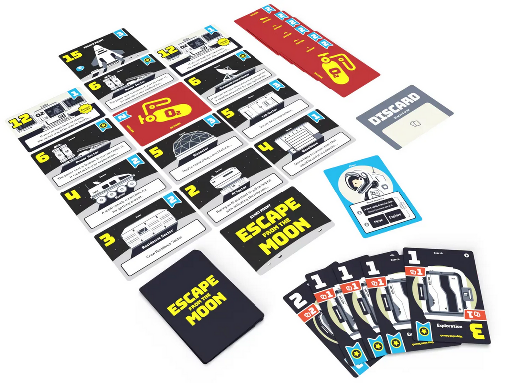There is not much time left for activities. Can you restore the rocket in time and return to the mother ship? The challenge to Escape from the Moon begins, with you constructing a deck and managing a hand of possible actions to get yourself to safety, with success or failure depending on the decisions you make and the difficulty of your chosen scenario.