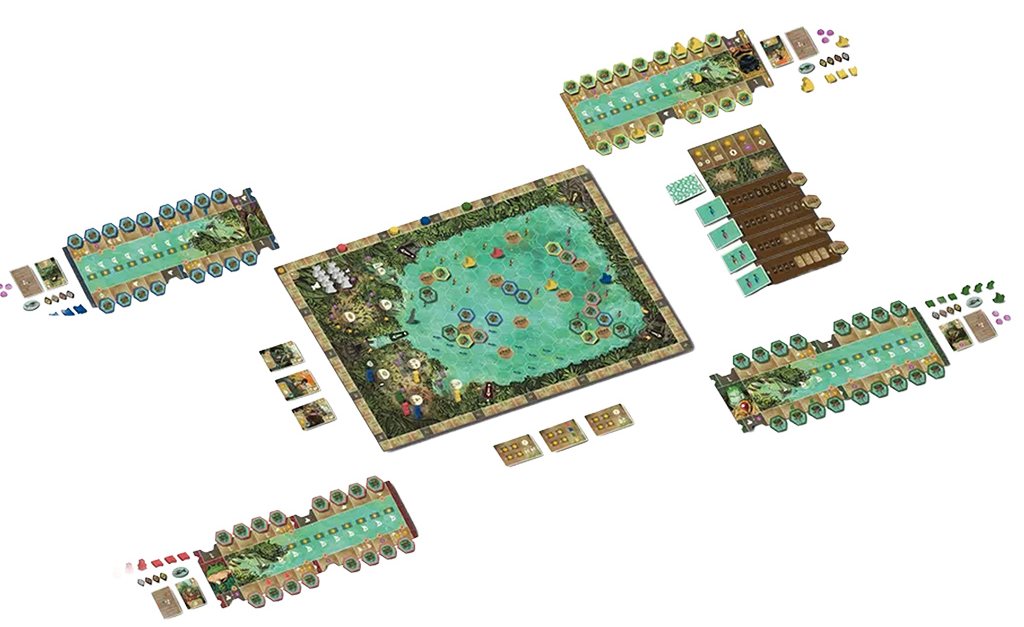 You take actions by moving your boats across the swamp, and these actions include fishing, trading with other clans, exploring abandoned temples in Feya, and building new settlements that will enhance your clan's abilities. Some actions don't require moving through the swamp, such as improving your navigation, which increases your boat speed; hosting festivals where each clan contributes fish to earn victory points; or building new cult spaces that bring prestige to the small islands that form in the swamp.