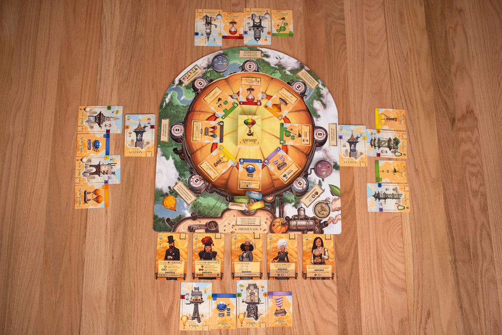 In Grand Central Skyport, you want to efficiently operate your airship station and attract the most prestigious tycoons to your city. During the game, you attract new airships to your skyport, and each airship has a color and an initial slotting movement. Try to maneuver your airships to group them by color so that they stack to score increasingly more points. Unfortunately, with each new ship entering your station, its movement will trigger the rearranging of previously placed airships, so ideally you can race other skyport owners around a central rondel to choose the incoming airships that are best for you.