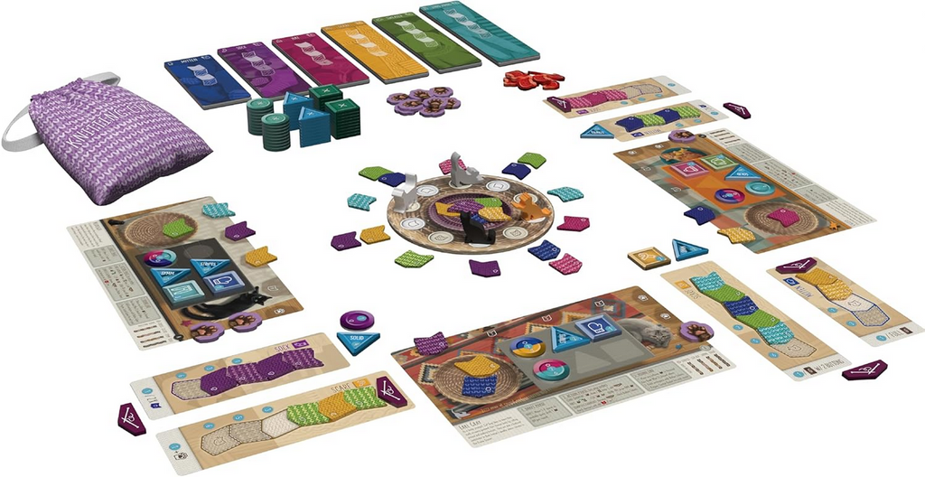 Rounds are simple - collect yarn from the central basket and knit it into garments while trying to get your color combinations and patterns just right! Earn victory points by completing garments, adding buttons, and fulfilling bonus scoring goals. Along the way, your furry feline friend can help you out by reaching their grabby paws into the bag to secure you the best yarn!
