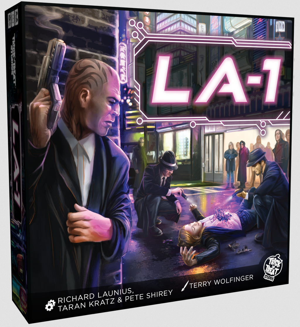 In the story-driven, co-operative adventure game LA-1, you take on the role of detectives working for Mace & Doyle Investigations who are helping one another to resolve cases in the post-apocalyptic city that was once Los Angeles. Each case can be played individually or as part of a campaign. Because of the multiple cards that can send investigations in different directions, it's possible to play each case more than one time, having different situations and outcomes each time. But cases must be solved before the Darkness closes in on all the investigators.