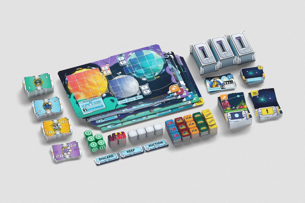 At the start of your turn, you draw three cards (one at a time), choosing one each to discard (which grants you a resource), keep (which grants you an action), or auction (which grants the winner both an action and a resource). To perform the Dutch auction in this game, use either a timer or the game's dedicated app — the more the timer ticks down, the less the winner will pay. Through these cards, you'll manipulate the market, play intergalactic mini-games, and resolve events. In the end, the player with the most money wins!