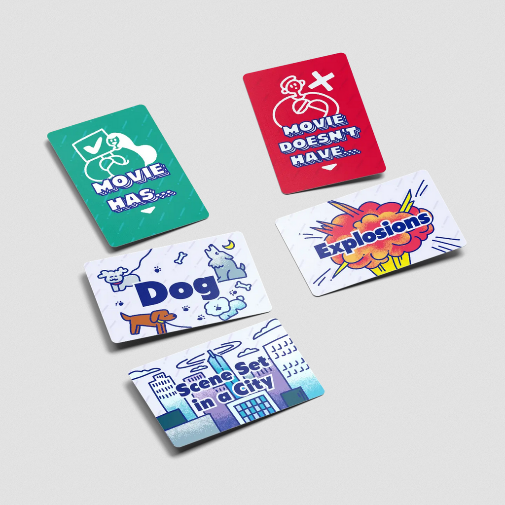 At the start of the round, draw a card for the “Movie has…” column. For example: “Female Main Character.” When the group has named a movie matching that description, flip the next description card. If it fits the movie you just named, add the description to the “Movie doesn’t have…” column.
