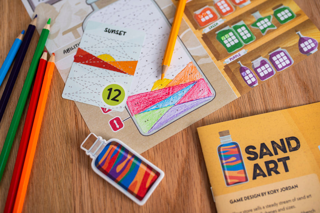 Sand Art is a unique entry in the "___ & write" style of games. During play, you move back and forth along a linear track of actions on the workbench, gathering different colors of sand in your supply, mixing primary colors of sand into new secondary colors, and pouring them into bottles to create patterns and images that will attract customers in your shop. Creating the most unique and visually pleasing bottles will earn you the most points.