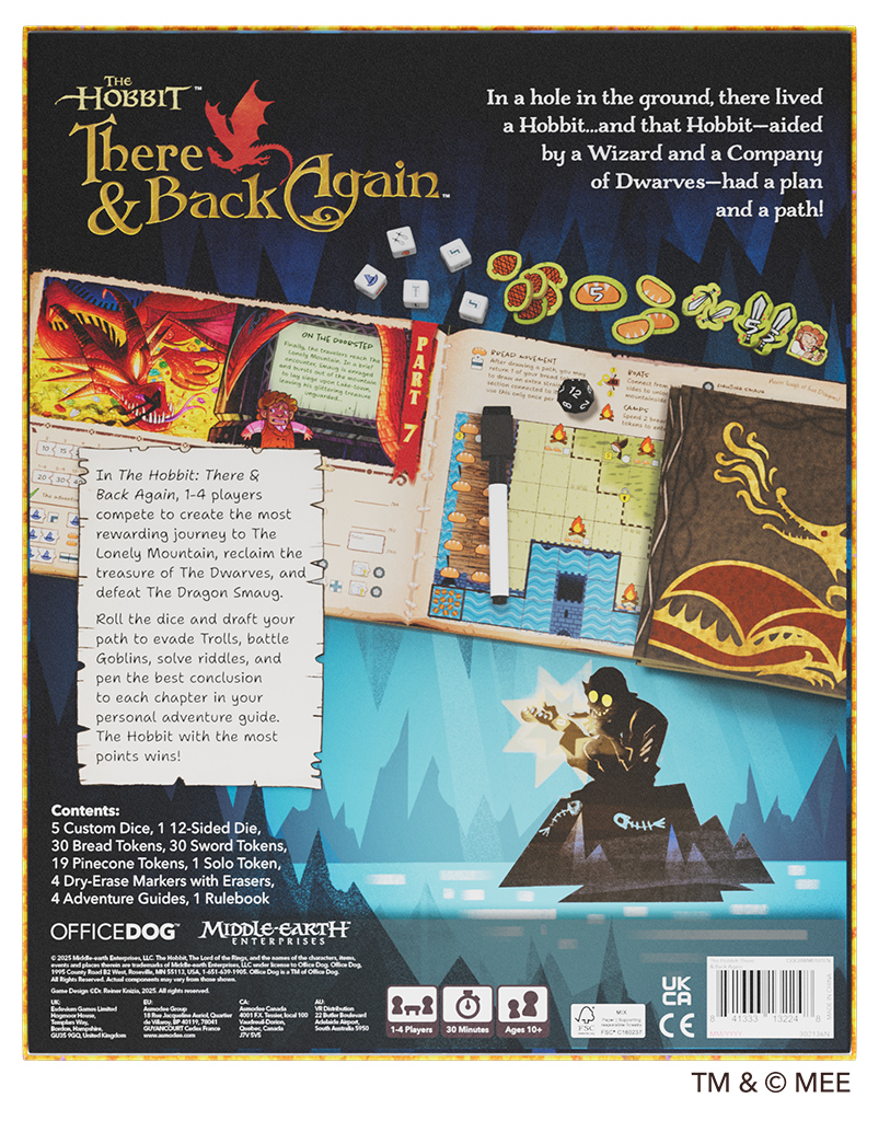 Embark your own adventure! The Hobbit: There & Back Again is an all new competitive, story-driven dice game from the master game designer, Reiner Knizia. Step into the pages of The Hobbit as you join Bilbo for 8 unique and replayable adventures. Draft dice to collect resources and overcome obstacles as you make your way from Bag End to The Lonely Mountain.
