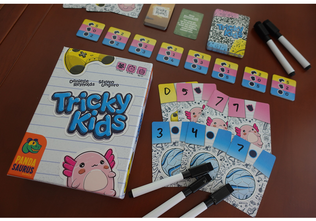 Welcome to the playground! In Tricky Kids, you and your classmates are trading toys and snacks in a chaotic kid-economy where value is totally made up. It’s a trick-taking game with a twist: you write the numbers on your cards. At the start of each round, you assign values that total 21 across your hand then use those cards to try to win tricks and collect points.