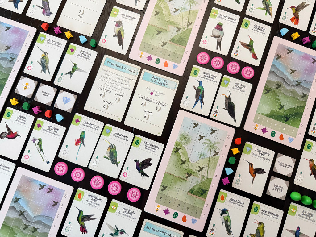 Hummingbirds make up about one tenth of the bird species in Latin America, delighting birders with their quick movements and shimmering feathers. Designer Elizabeth Hargrave and artists Natalia Rojas, Ana Maria Martinez Jaramillo, and Martha Clare highlight them in this expansion with a special deck that adds a twist to gameplay.