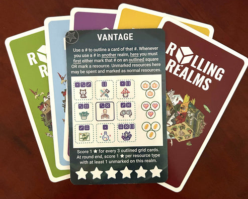 Expand your copy of Rolling Realms with this set of 6 promo cards inspired by Vantage!