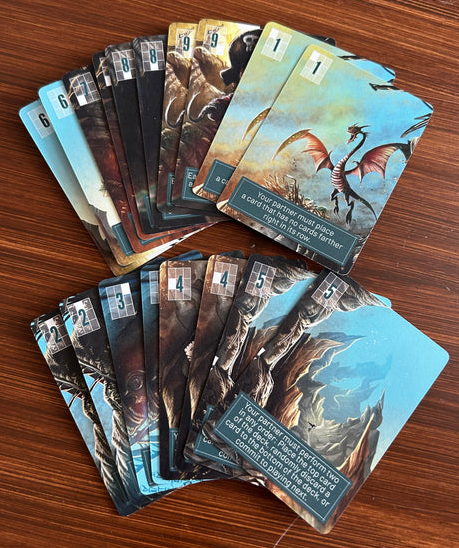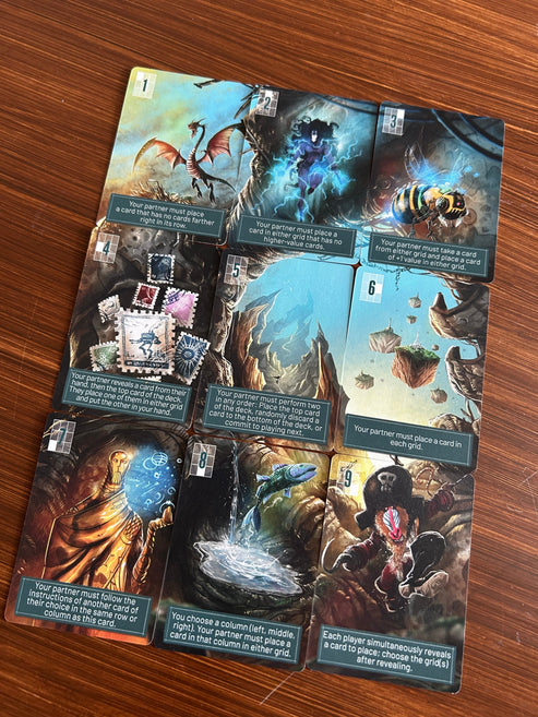 Smitten's core design was inspired by comic book cards from Jamey’s youth, specifically a set where various cards formed a cohesive 9-card panorama image. In trying to complete two of these images in Smitten, there is no set turn order; rather, players indicate a preference to play or not play a card. The played card has instructions for the other player to place a card, which they must do or the game instantly ends.