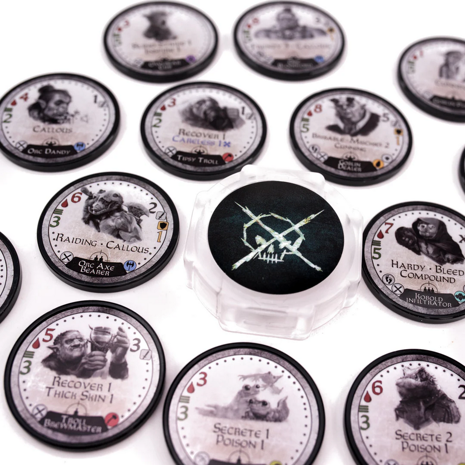 With a new mix of General, Special, Solo, and Tyrant Encounters, the narrative of the Gearloc plight continues to evolve. The content is compatible with Too Many Bones and Undertow, though it focuses on land-based Encounters and expands the original TMB Baddie types: Goblins, Bogs, Scales, Beasts, Trolls, and Orcs.