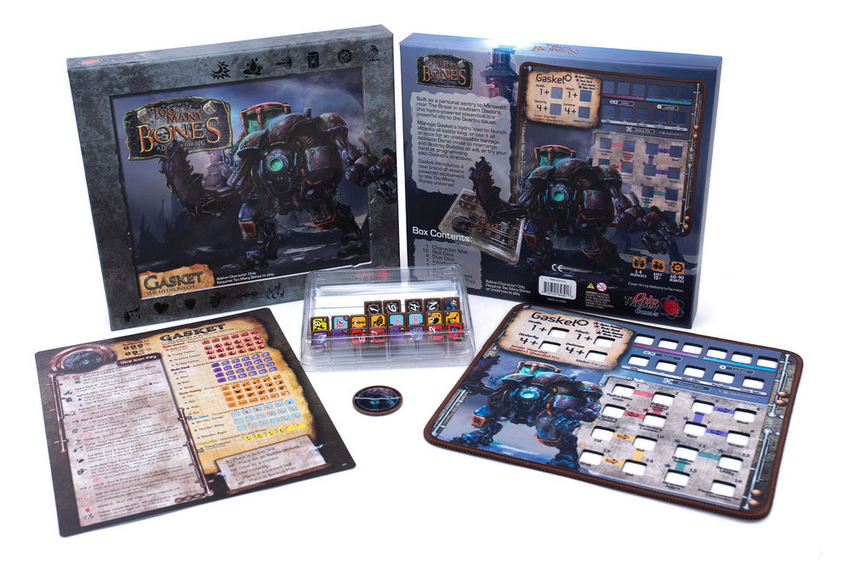 Gasket comes with his own set of 21 beautiful custom dice, an 11.5 gram chip, closeable dice holder, and a neoprene character mat.