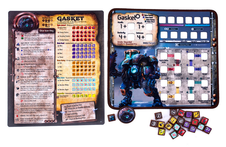 Gasket is a melee-ranged Hydromech. He depends heavily on the availability of water for his skills. His starting defense stat is very high whilst his attack and health stat starts at the minimum of one. Gasket is able to perform position manipulation, boost his defense or attack stat and disrupt the skills or movement of the baddies. The backup plan allows him to deal damage, repair himself or to perform a devastating crowd control skill. Another unique ability of him allows him to lock commands in the backup plan and chain them. Once your bones reach your placed skill dice you are able to perform alternative and powerfull effects.