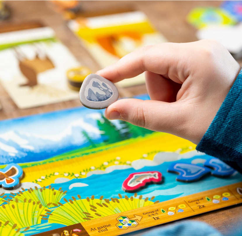 On your turn, build out your map and match animals and habitats to add sightings to your panorama and score points! Cascadia Junior lets younger players experience the spatial puzzle of the award-winning board game Cascadia. This stand-alone game teaches pattern building, set collection, and basic addition.