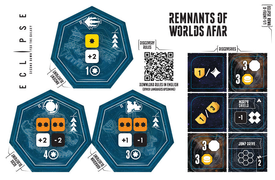 Eclipse 2nd Dawn - Remnants of Worlds Afar is a small punch sheet. It contains the last playable things not previously made available from the Worlds Afar Collection that was a part of the Kickstarter campaign in 2020. The sheet is "free", but for customs technical reasons it has to cost something, so it has a cost of one euro cent.