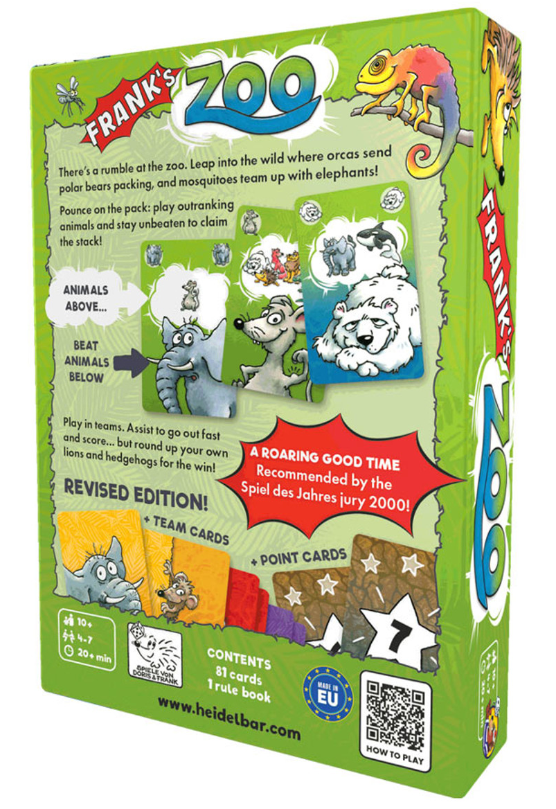 This revised edition of the worldwide classic Frank's Zoo gives the game a fresh coat of paint. Already on the longlist for the 2000 Game of the Year in 2000, the game continues to delight families and frequent players worldwide. The illustrations were carefully designed by industry legend Doris Matthäus but the game itself remains true to its proven core.