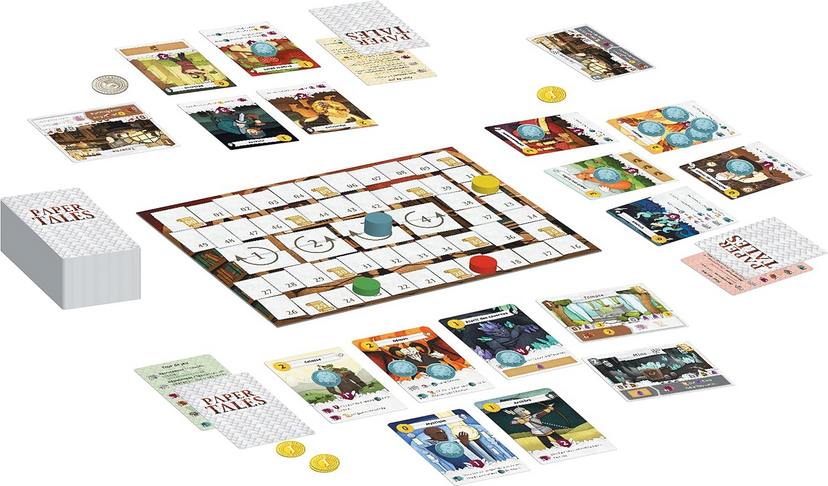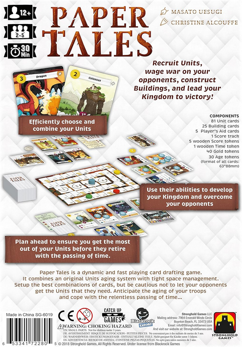 In more detail, Paper Tales is a simultaneous drafting card game. Each turn, players draft five units that they then recruit into their kingdom — assuming that they can pay. These choices determine the players ability to shine in battle, generate great income, construct dominant buildings, and earn legend points. There are only four hiring positions available during the four rounds of the play, but your units grow older with each turn until time takes them away.