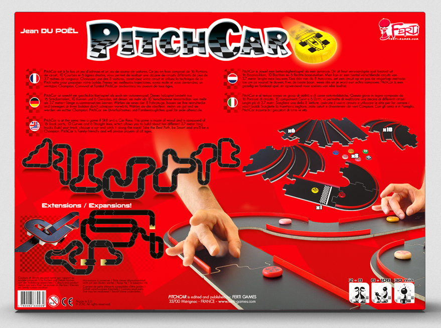 Build your own track, choose your car, and pitch it! Choose the best trajectory using the safety rails, stay on your wheels and don't go off the track if you don't want a penalty! This outstandingly beautiful game of skill is made of wood and is composed of 16 track parts, which allow you to build a vast number of 3.9 meter long tracks.